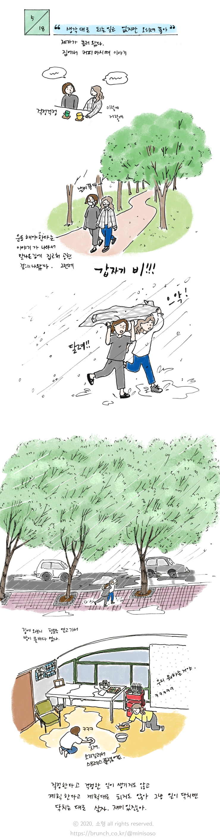산책 나갈 때는 선선하니 좋던 날씨가 공원을 한 바퀴 걷자 갑자기 소나기로 변했다. 천둥번개에 거센 바람이 불고 장대비가 정신없이 내렸다. 건물 처마에서 잠시 비를 피했다가 서둘러 집에 뛰어 들어오니 열고 나간 창문으로 비가 들이쳐 방바닥이 물바다였다. 스퀴즈로 물을 모으고 걸레로 물을 닦아내며 찝찝하고 힘든데 상황이 웃겨서 웃음이 나온다. 평화롭게 이야기 나누고 산책할 때만 해도 비에 젖어 방바닥을 닦게 될 줄은 몰랐지.