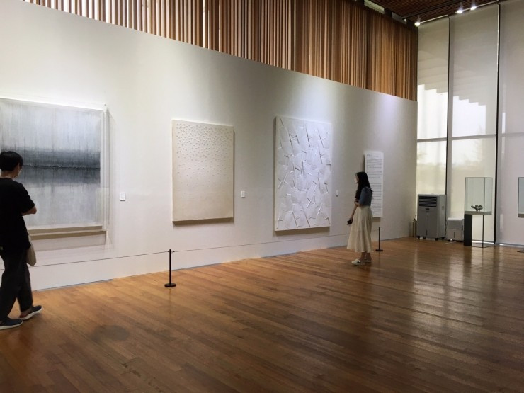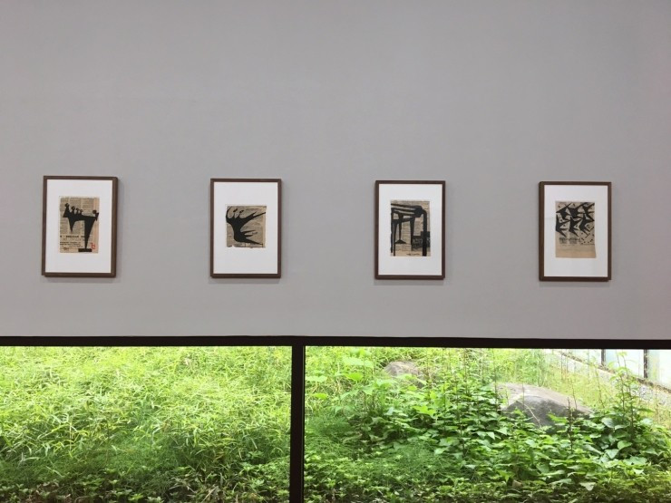 이응노의 작품 말고도 전광영, 박철, 한기주등 종이로 작업한 다른 작가들의 작품들도 전시되어있다. 왼쪽 두 작품은 권영우의 작업인데 종이가 가진 물성을 탐구한다. 우리가 알던 종이를 새롭게 볼 수 있도록 관객을 유도하는 작업이었다. 종이에 흠집을 내고 긁고 찢어서 찢어지고 번지고 물에 젖는 종이라는 물질에 대해 보여준다. 이응노의 작품은 종이 꼴라주라고 하지만 꼴라주라기보다 '종이로 그린 그림'이라고 평론가는 평가했는데 작품을 보니 공감이 갔다. 보통 꼴라주라면 꼴라주되는 물체가 주제와 연관이 있던지 꼴라주 되는 물체의 물성이 주된 탐구 대상인 경우가 많은데 이응노의 작품은 자기 스타일의 추상작품을 위해서 종이를 표현 수단으로, 그냥 물감처럼 사용한다.