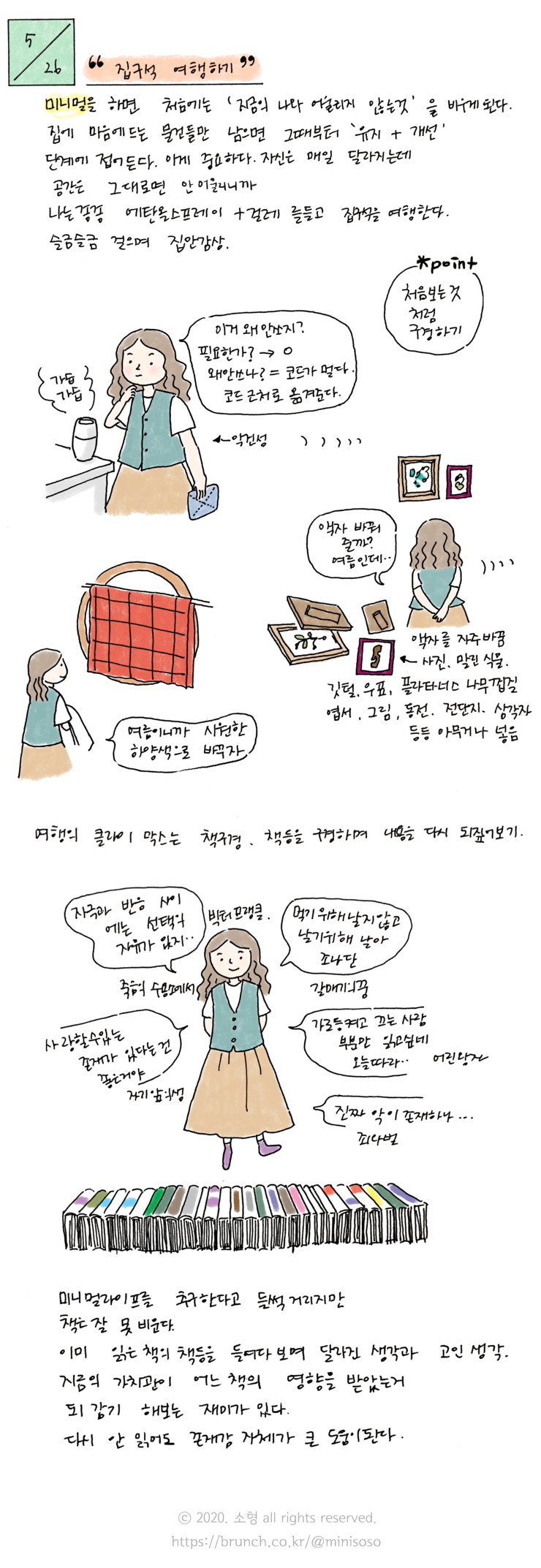 알랭 드 보통 '여행의 기술'을 보면 마지막 부분에 '나의 침실 여행'이라는 책을 출간한 작가의 이야기가 나오는데 그 부분을 읽고 나랑 비슷한 사람이 있네... 하는 생각을 했다. 나도 종종 집안 구석구석을 돌아다니며 낯설게 보기를 시도한다. 집에 놓인 물건들과 그 물건이 놓여 있는 위치, 색, 디자인, 쓸모, 물건에 관련된 기억을 되짚어본다. 그러다 보면 자연스럽게 나의 취향을 확인하게 되고 취향을 보면 추구하고 싶어 하는 삶의 방향성도 알 수 있다. 그리고 읽은 책, 사놓고 안 읽은 책 들을 가만가만 살펴보면 과거의 자신을 만날 수 있다. 바뀐 생각과 가치관을 발견하기도 하고 변치 않고 그대로인 부분을 확인하기도 한다.