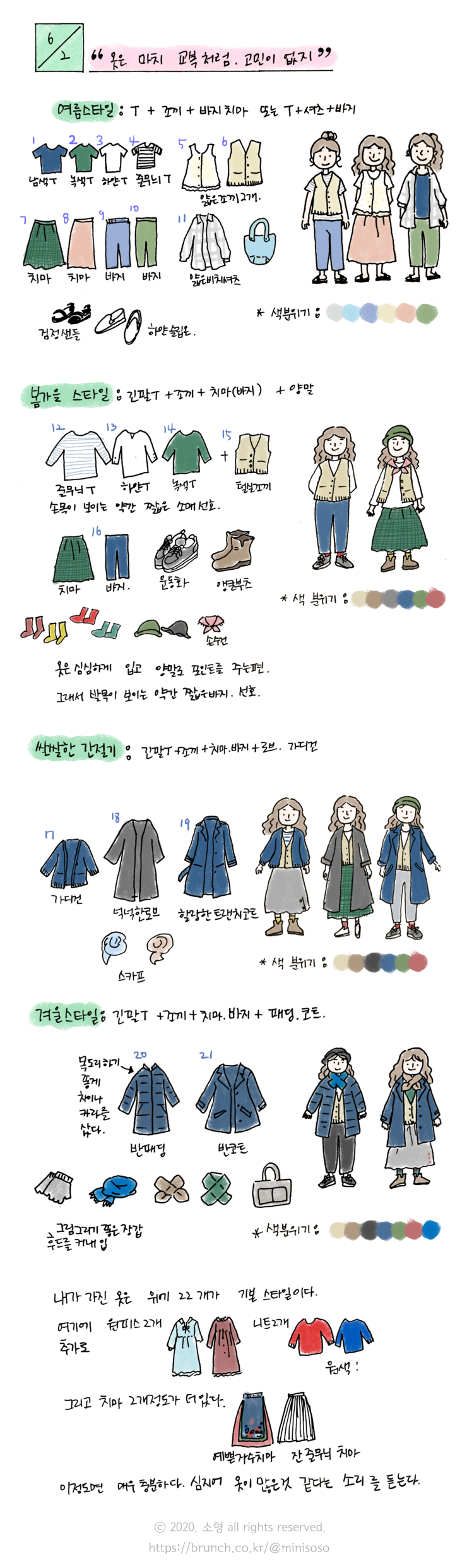 매치하기 쉬운 진녹색, 남색, 베이지, 아이보리, 회색, 하얀색을 기본색으로 디자인도 아주 기본에 충실한 디자인의 옷, 대부분 무늬 없는 무지 옷을 산다. 스티브 잡스처럼 사복의 제복화까지는 아니지만 나름 편리한 옷 입기 방식이다.