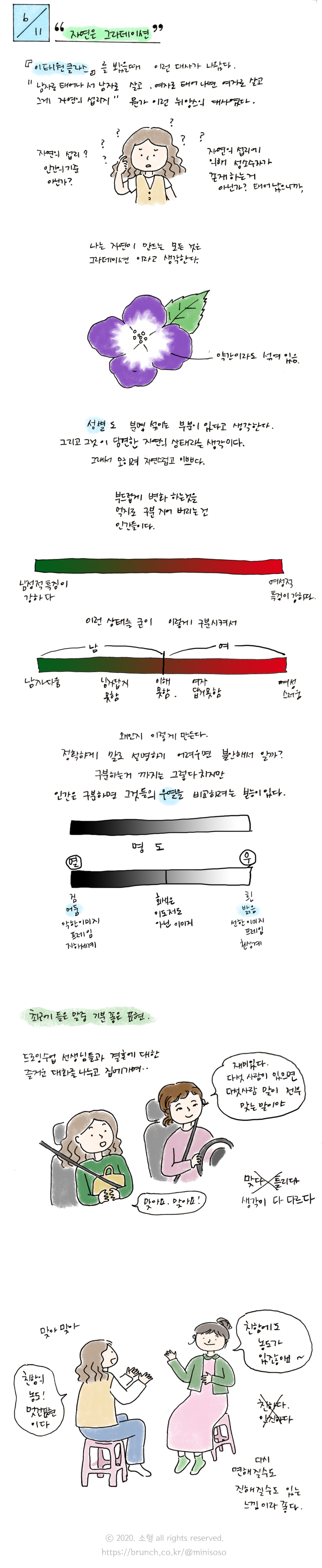 성공 실패, 남자 여자, 선 악 이렇게 이분법으로 나누고 위아래로 차등을 두는 수직적 세계관이 보편적인 세상이라 주변에서 그렇게 살면 안 된다. 너처럼 살면 세상 살기 힘들다 불리하다. 하는 소리를 많이 듣는데 내 생각에는 살기 힘들면 힘든 데로 불리하면 불리한 데로 살면 된다.