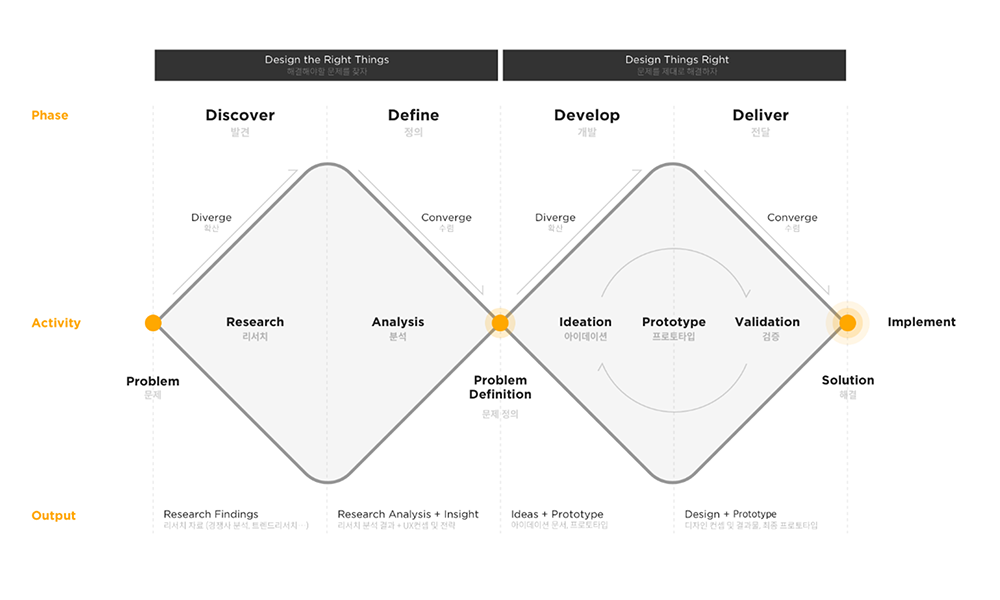 이 책에서 하나 인상깊었던 것은 '확산과 수렴'에 대한 내용이다. 확산은 획일화된 아이디어에서 벗어나 최대한 다양한 아이디어를 구상해보는 것이다. 반면 수렴은 확산한 것들 중 가장 좋은 것을 찾아 하나로 모아가는 과정이다. 확산과 수렴은 반복하며 UX 개선이 일어난다. 이와 관련한 모델이 '더블 다이아몬드 모델'이다.