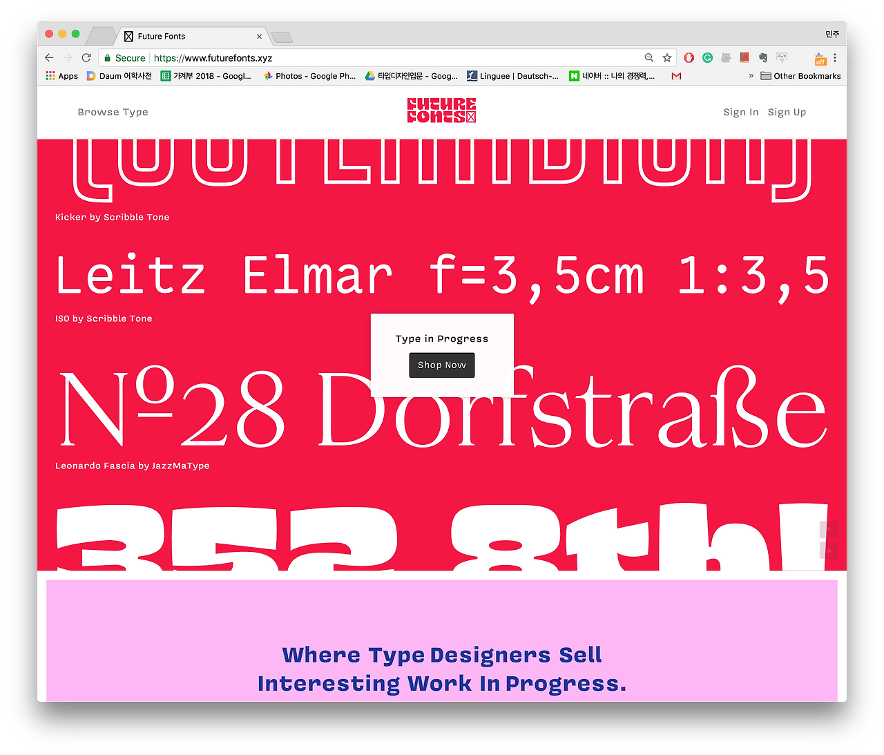 얼마전 퓨쳐폰트(Future Font)라는 미국의 한 폰트 로스팅프로그램을 진행하는 사이트에서 연락이 왔다. 누군가가 내 작업을 보고 추천을 했다고 한다. 이 사이트는 아직 미완성이면서, 현재 제작중인 폰트를 판매하는 곳이다. 일찍 구매한 사람은 저렴한 가격으로 폰트를 완성버전, 끝까지 업그레이드 받을 수 있고, 동시에 타입디자이너들은 글자의 가능성을 보여주며 판매할 수 있다. 업데이트가 진행될 때마다 가격이 조금씩 올라간다. 무엇보다도 고객과 디자이너 사이에 소통이 이루어지고, 건의사항과 의견을 적극적으로 반영한 업데이트가 이루어지므로 정말 참신한 아이디어라고 평소에 눈여겨 보았던 곳이라고 무척이나 영광스러웠다.