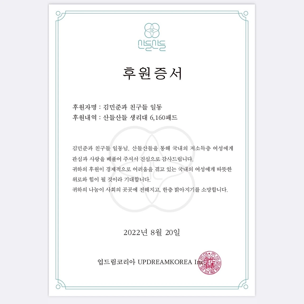올 해 제 생일을 기념해, 친구들과 함께 생리대를 기부했습니다. 생리대 브랜드 "산들산들" 의 유기농 생리대로 선택하였고, 센서티브 플러스 중형과 대형으로 약 6,100개 물량입니다.