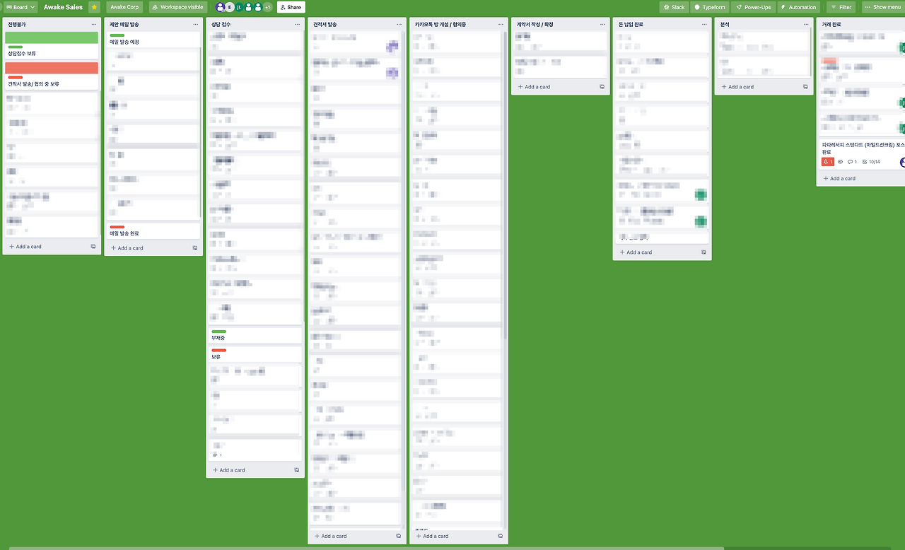 저희는 타입폼을 통해 들어온 DB가 자동으로 "상담 접수" 보드에 각 브랜드별로 프로젝트가 생성되게 됩니다. 그래서 영업 프로세스 (진행 불가를 제외하고는) '접수~제안 메일 발송~상담~견적서발송~실무자간 카카오톡 방 개설~가격 협의~계약서 작성~돈 납입~실무진행~성과분석~거래완료' 과정마다 "상담 접수" 보드에 자동으로 들어온 DB를 실무자들이 프로세스별 보드를 이동하면서, 각 광고주별 진행 단계를 시각적으로 파악합니다.