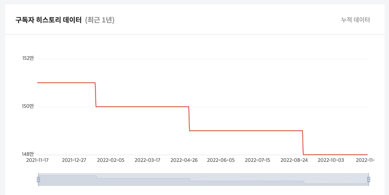 이 구독자 히스토리는 2014 ~ 16년 정도에 유튜브 팬페스트 콘서트에도 스피커로 참가했던 크리에이터 중 한 명이에요. 최근에는 해당 크리에이터가 주로 활동하는 분야에서 라이징 유튜버가 더 많아지기도 했지만, 사실 알고리즘에서 많은 부분 이탈 됐다고 보고 있어요. 고로 1년 단위로 보면 구독자가 점점 떨어지는 것을 볼 수 있었죠.