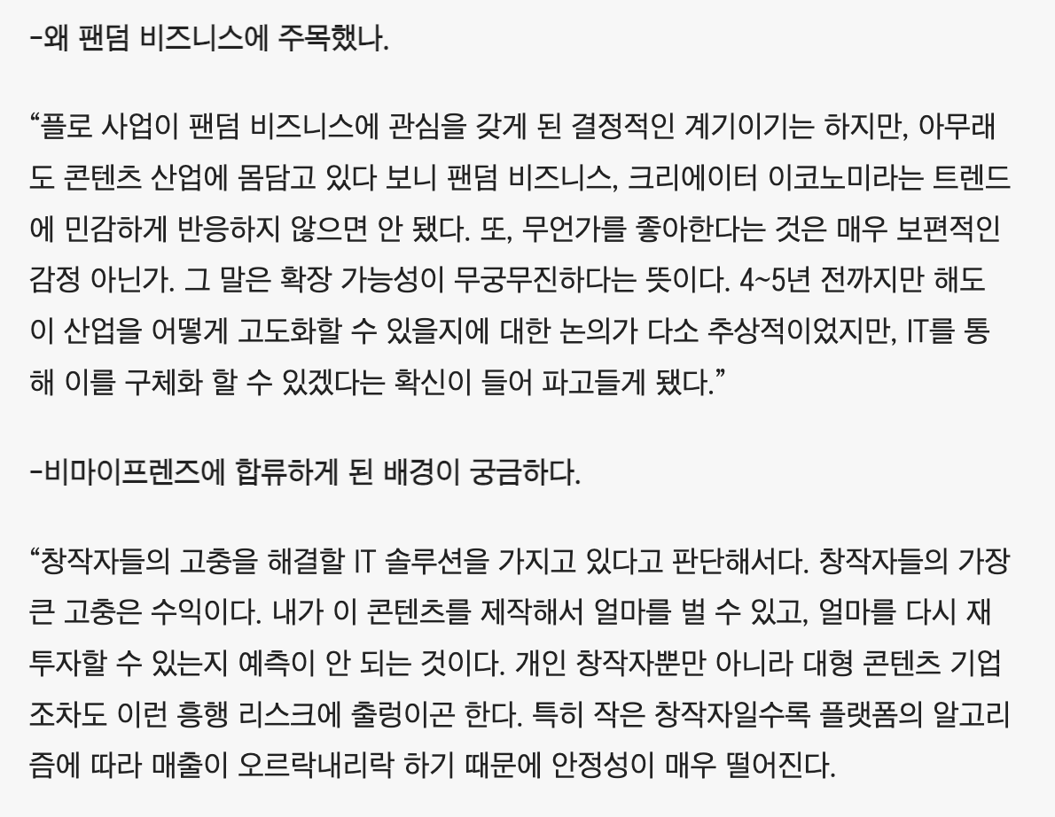 비마이프렌즈가 바라보는 크리에이터 이코노미의 문제점은 "수익 예측" 그리고 "플랫폼 알고리즘 의존도"를 본 것 같아요. 예시를 들자면, 크리에이터는 유튜브의 알고리즘으로 비구독자에게도 컨텐츠를 확산 할 수 있고, 그 확산은 본인이 컨텐츠를 잘 만드는 것도 중요하겠지만 특정 조건으로 구성됐을 유튜브 알고리즘에 컨텐츠가 걸려들어야 확산 될 수 있다는 것이에요. 알고리즘 덕분에 컨텐츠가 크게 확산 될 수 있지만, 반대로 영향력을 갖고 있다가도 알고리즘에 버려지기라도 한다면 아무리 구독하고 있는 팬에게도 컨텐츠가 제대로 안보일 가능성도 높죠.