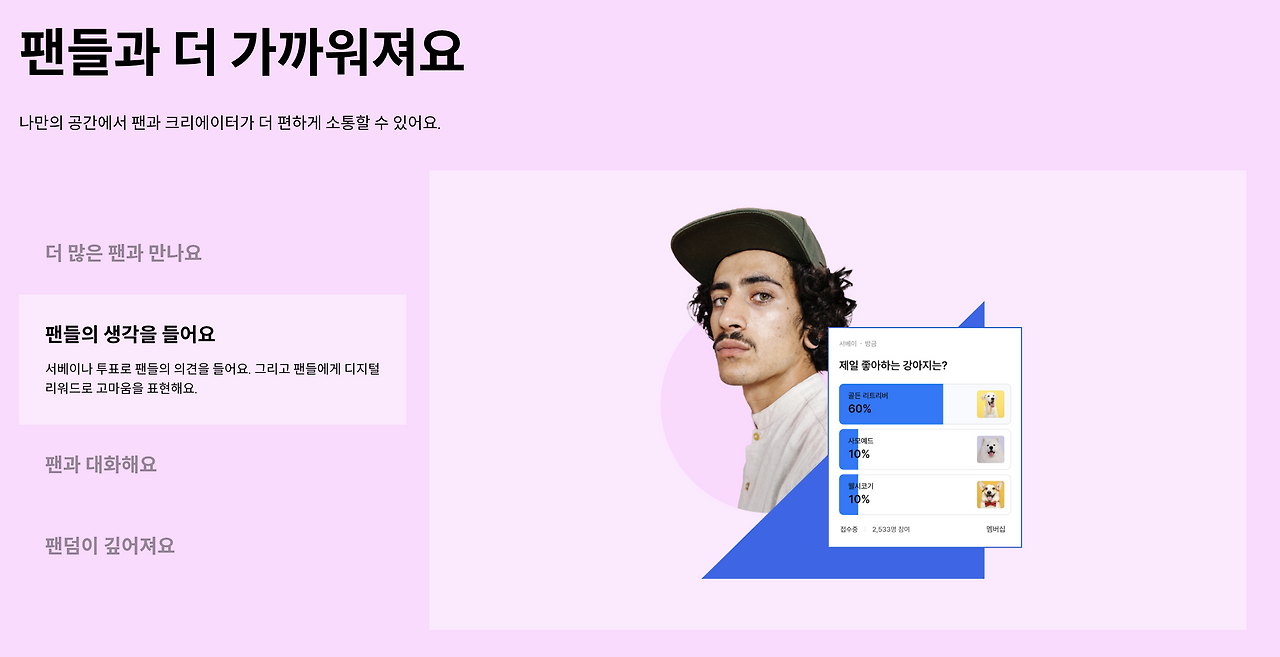 글로벌 크리에이터 및 브랜드(기업)가 팬들과 긴밀히 소통하고 창의성을 발휘하며, 수익을 창출하도록 돕는 솔루션 및 서비스를 제공한다고 합니다.