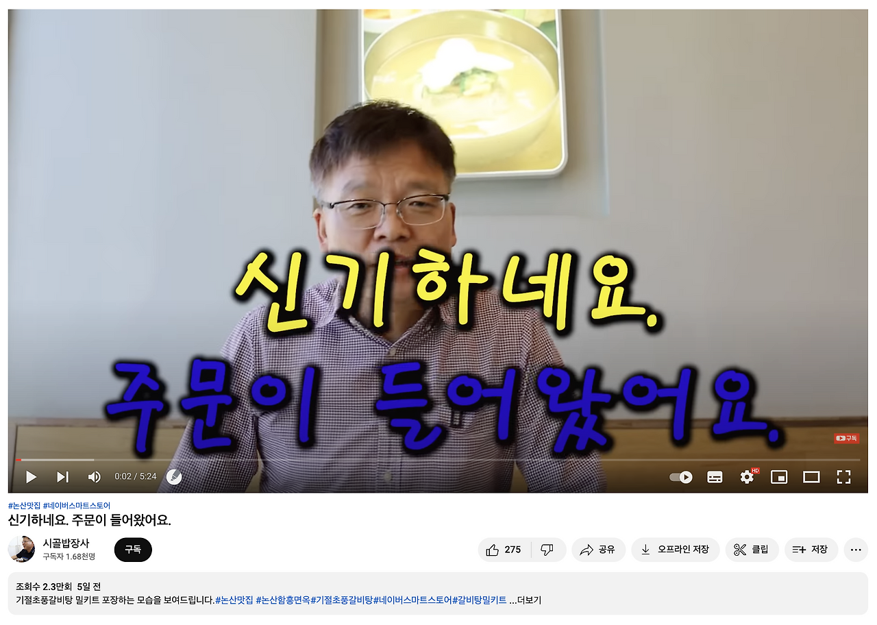 아래 영상은 유튜버 "시골밥장사" 님의 컨텐츠인데, 지방 논산에서 갈비탕 식당을 운영하시는 사장님이세요. 촬영도 핸드폰으로 하신 것 같고, 편집도 조금은 엉성한 감이 있어요. "신기하네요. 주문이 들어왔어요" 자막이 수 초간 계속 가만히 있거든요. 사장님 얼굴도 잘라먹고요. (ㅜㅜ)
