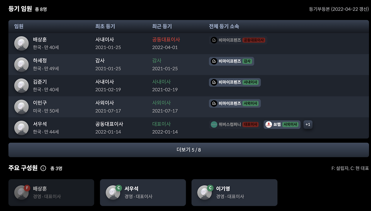 비마이프렌즈 회사를 창업 팀은 하이브의 팬덤 플랫폼 '위버스'를 개발했던 팀에서 시작됐어요. 배상훈 최고운영책임자(COO)와 김준기 최고기술경영자(CTO)가 창업했고, 서우석 전 위버스컴퍼니 대표 겸 하이브 기술고문님께서 CEO로 합류하신 것 같아요. 배상훈 대표님은 올 해 4월에 사임하신 것으로 보이는데요. 이미 '위버스'를 성공까지 만든 팀이라는 점과 모든 임원분들께서 엄청난 커리어를 갖고 계신 선배님들이라는 점이 특징 같아요.