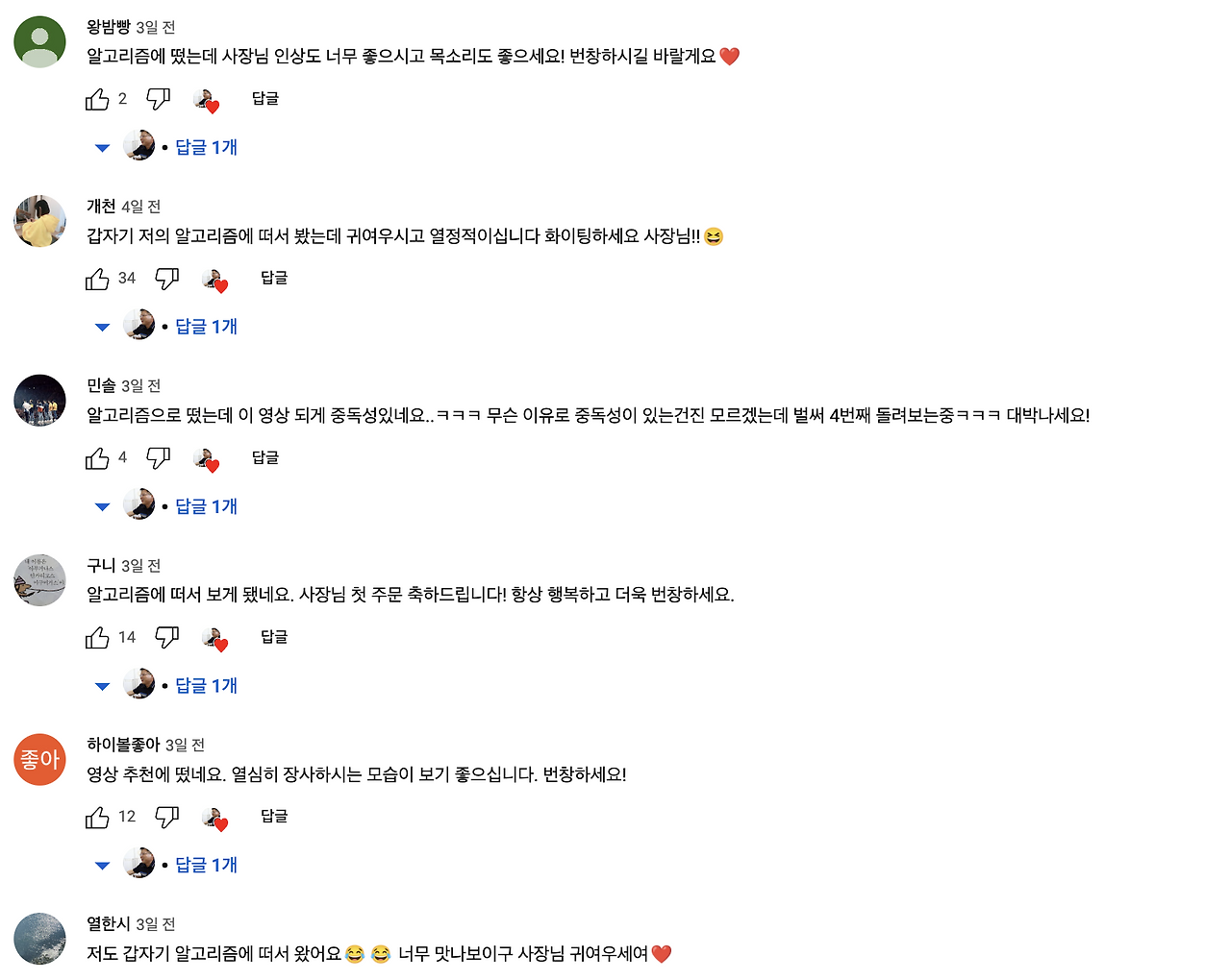 다들 알고리즘에 떠서 우연찮게 컨텐츠를 보았다고 해요. 이런 식으로 크리에이터는 SNS 알고리즘 기류에 들어와야 컨텐츠가 확산 될 수 있고, 그만큼 위험도 존재한다고 볼 수 있겠죠. 알고리즘에 뜨지 않는다면 자연스럽게 구독자 수와 조회수가 성장하기 어렵고, 그만큼 수익도 떨어질 것이구요.