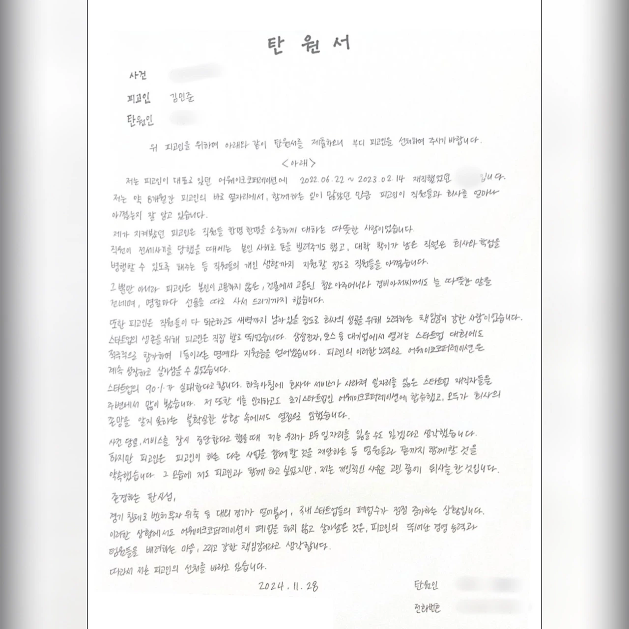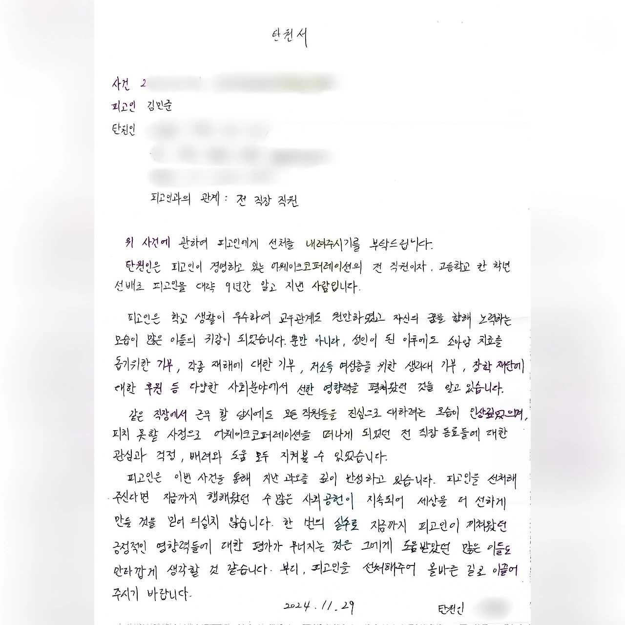 전 직원이자, 고등학교 한 학년 선배로 피고인을 대략 9년간 알고 지낸 사람입니다. 피고인은 학교 생활이 우수하여 교우 관계도 원만하였고 자신의 꿈을 향해 노력하는 모습이 많은 이들의 귀감이 되었습니다. 성인이 된 이후에도 소아암 치료를 돕기 위한 기부, 각종 재해에 대한 기부, 저소득 여성층을 위한 생리대 기부, 장학 재단에 대한 후원 등 다양한 사회 분야에서 선한 영향력을 펼쳐왔던 것을 알고 있습니다. 같은 직장에서 근무 할 당시에도 모든 직원들을 진심으로 대하려는 모습이 인상 깊었으며, 피치 못할 사정으로 어웨이크코퍼레이션을 떠나게 되었던 전 직장 동료들에 대한 관심과 걱정, 배려와 도움 모두 지켜볼 수 있었습니다. 지금까지 피고인이 끼쳐왔던 긍정적인 영향력들에 대한 평가가 무너지는 것은 그에게 도움 받았던 많은 이들도 안타깝게 생각할 것 같습니다.