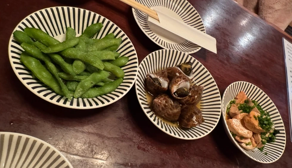 6. 테이블 위에 기본 찬이 올라온다. 콩, 소라, 아귀간. 잠깐, 아귀간? 이게 기본 찬이라고? 먹어보니 이건 기본이 아니라 요리다. 우리 테이블에 있는 세 접시를 본 뒷 테이블에 한국인이 있었는지, 속삭인다. ‘우리는 저런 거 안 줬는데.’ 뒤이어 복어 튀김, 육회, 회 한 접시가 나온다. ‘고레와 난데스까?’라고 물어보니 친구는 복어 튀김을 번역기로, 육회를 영어로 horse meat라고, 회를 tuna라고 말한다. 아니, 육회가 말고기라고?! 한국에서도 못 먹어본 말고기 육회를 먹어볼 기회다. 메이트는 복어 튀김을 처음 먹어본다. 모든 게 새로움 천지다. 내가 먹기엔 한국에서 먹은 복어 튀김보다는 조금 더 바삭한 식감과 짭조름한 맛이 인상적이다. 메이트는 제주에서 먹은 말고기 육회에서는 말고기 특유의 냄새가 있었는데, 이번 말고기 육회는 그 냄새가 아예 안 느껴진다고 한다. 같은 재료를 써도 어떻게 맛을 내느냐에 따라 이렇게까지 다를 수 있나? 동시에 매번 같은 여행(먹고 보고 놀고)이었는데 이렇게까지 새롭고 신기한 경험이 이어질 수 있나? 물음표가 그치지 않는다.