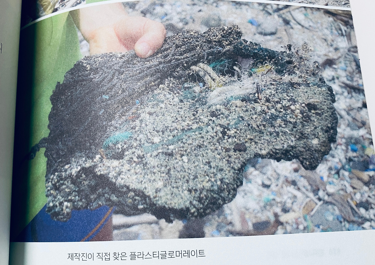 반대로 작아지지 않고 묵직해진 플라스틱도 있다. 열, 압력으로 산호나 돌과 결합되어 ‘플라스틱글로머레이트’라는 신종 암석이 되기도 한다. 화산섬 하와이에서 흔하게 발견되며 인류세를 상징하고 있다. (p.168)