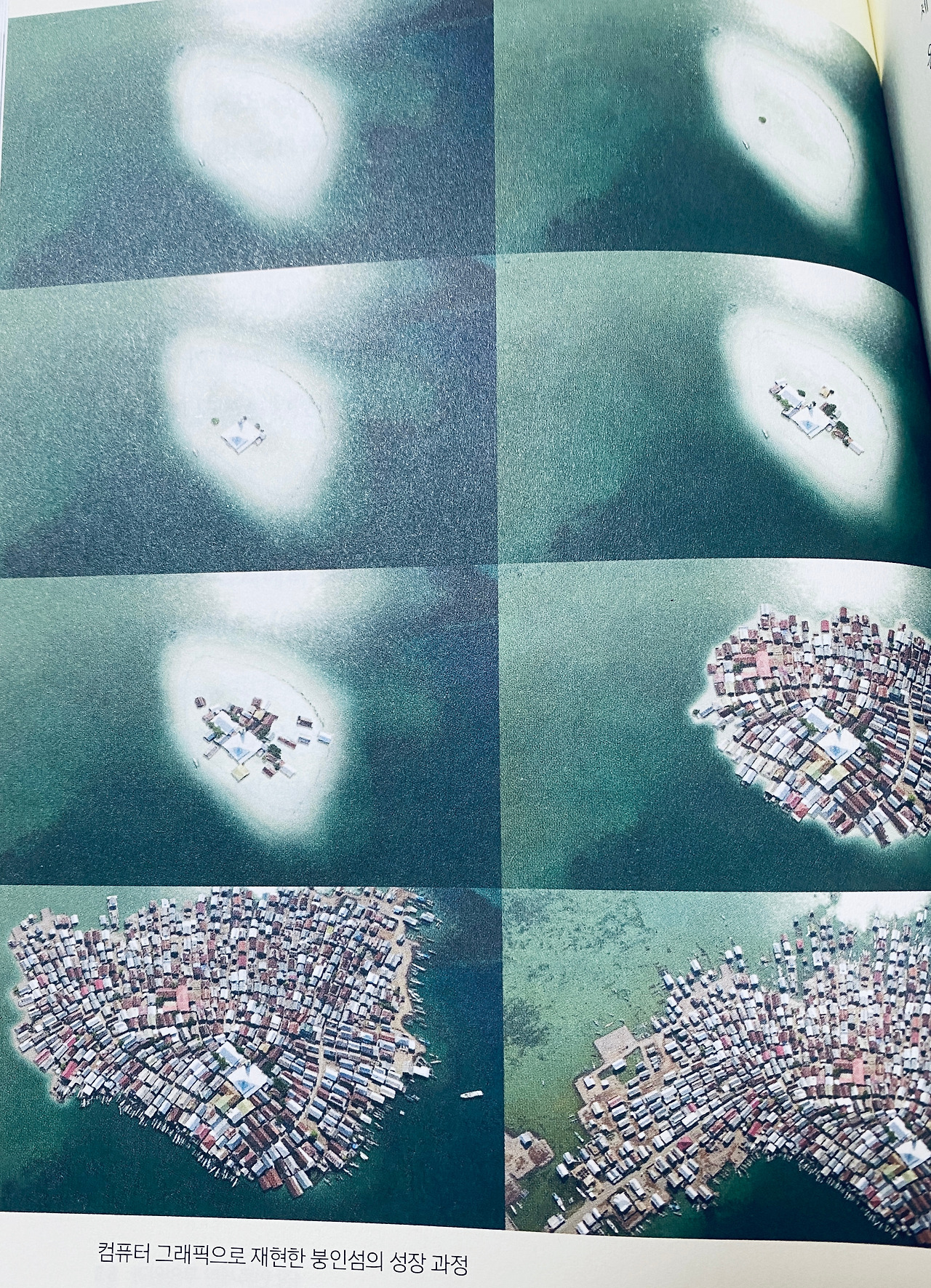 책에서는 지구를 일억분의 일로 축소한 섬이 소개된다. 인도네시아 붕인섬이다. 200년 전 천혜의 섬에 소수의 사람이 정착했다. 지금은 3,400명 정도가 다닥다닥 붙어살고 있다. 그동안 인구가 늘어남에 따라 주변 바다는 파괴되었다. 사람들이 흘려보내는 생활하수와 쓰레기의 영향이다. 황금어장은 사라지고, 산호는 40% 이상 훼손되었으며, 주변은 플라스틱으로 넘쳐난다. 붕인섬은 더는 희망이 없는 걸까? 위기를 느낀 일부 젊은이들은 행동하기 시작했다. 주민들의 의식이 점차 바뀌고 있다고 한다. 지속 가능한 어업을 위해 물고기를 양식하고 산호를 살리기 위한 노력을 하고 있다.