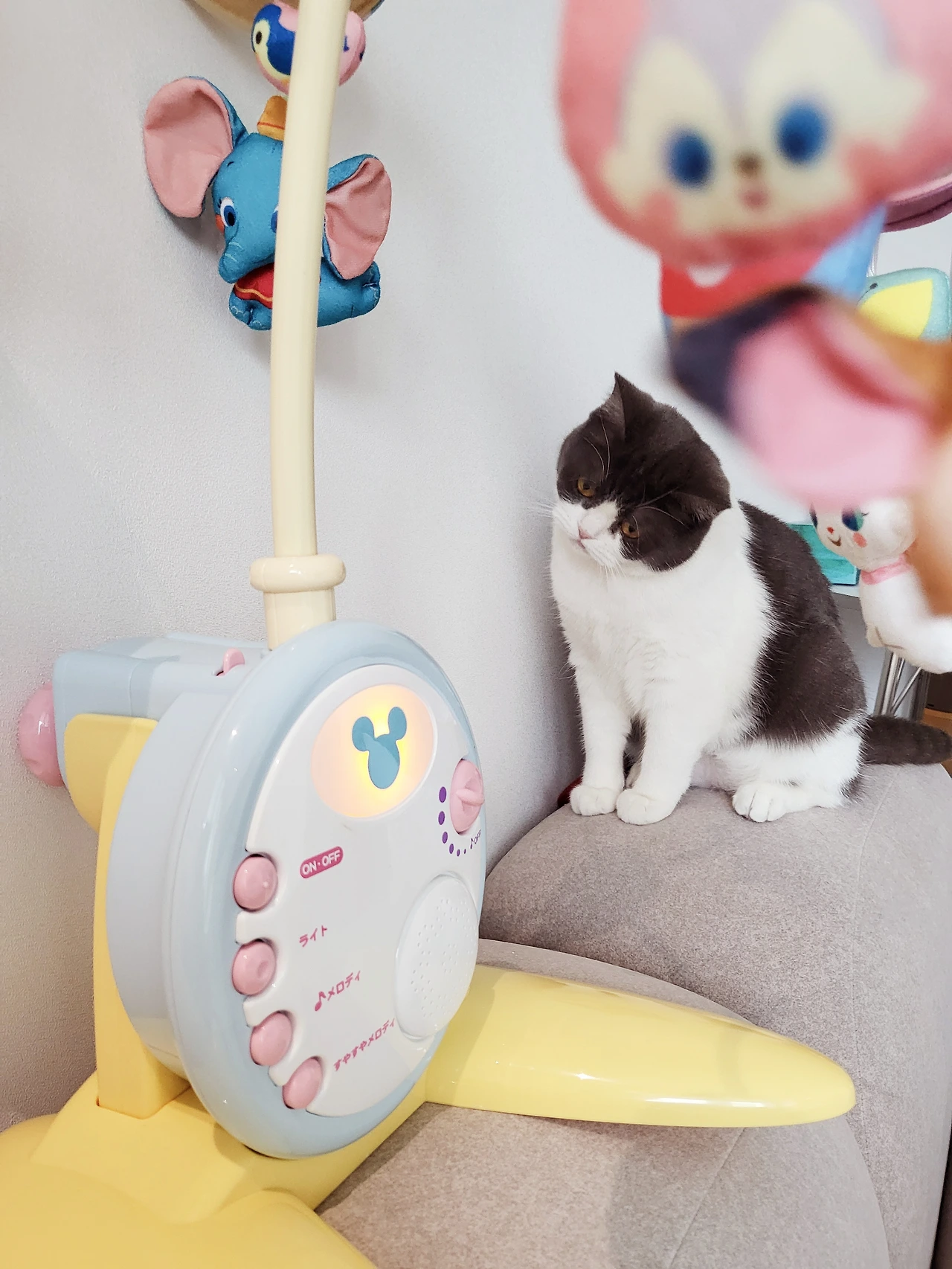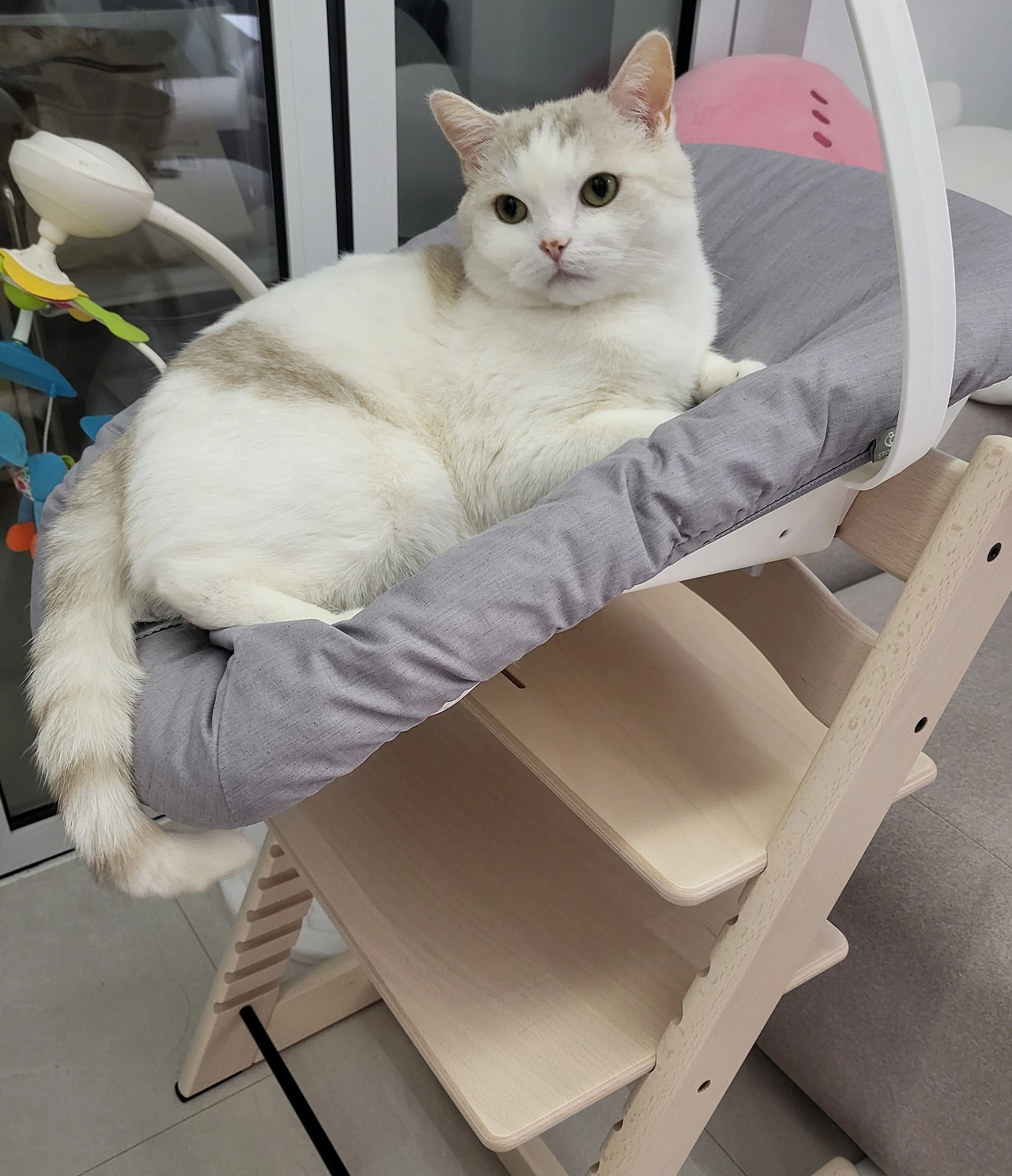 푹신한 장소를 찾아다니는 고양이들 특성상 아기 용품은 최적의 장소였던 것이다.