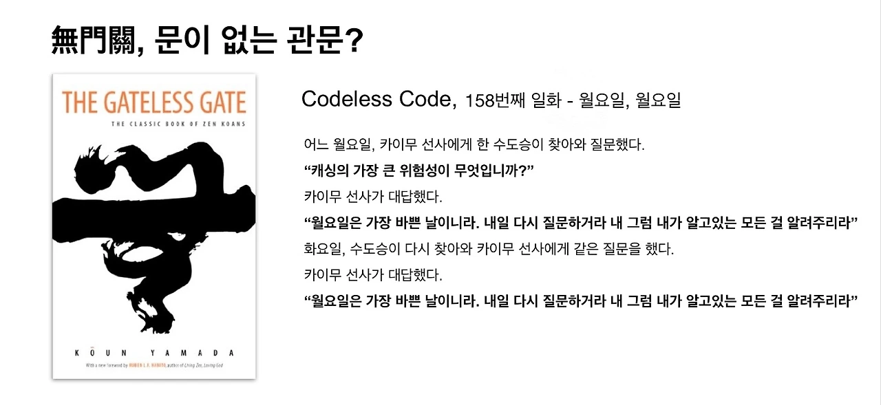 “무문관”의 이름을 본떠 만든 “코드 없는 코드 Codeless Code”에는 소프트웨어 엔지니어들의 공감을 살만한 공안들이 실려있습니다. 그 중, 제가 재밌게 봤던 158번째 일화를 소개하겠습니다.