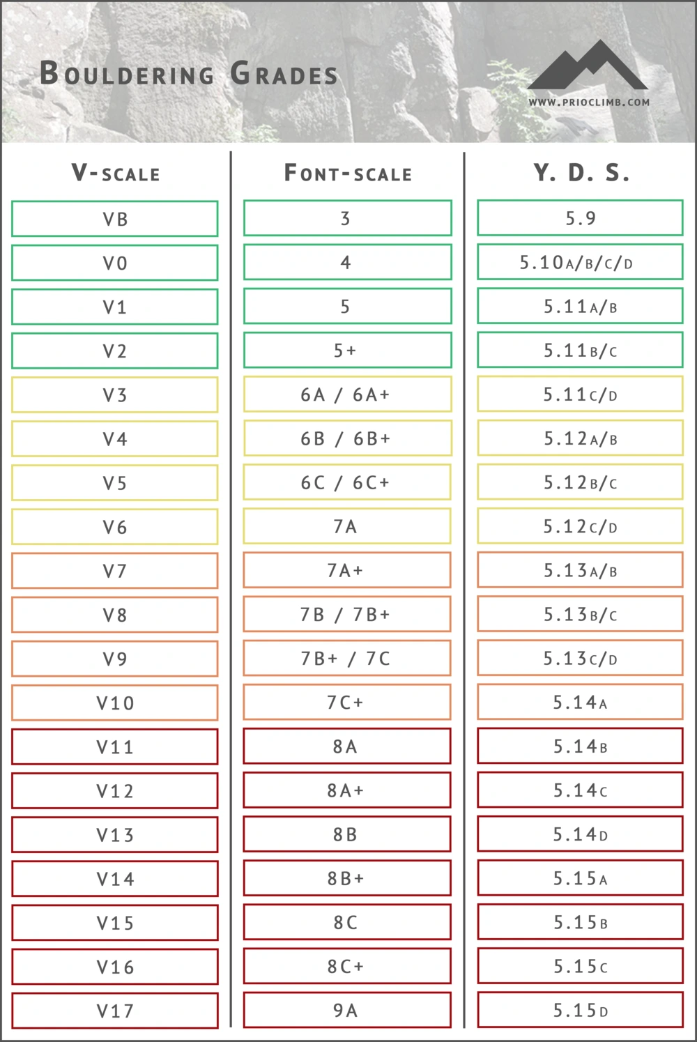 클라이밍 지구력/볼더링 문제에는 난이도가 부여되어 있습니다. 보통 암장들마다 각자 나름의 색을 이용하여 난이도를 구분하고 있습니다. 이런 주관적인 구분으로는 난이도 비교가 어렵기 때문에 국제적으로 사용하는 난이도 체계가 있습니다. 보통 아래 그림에 나타난 세 가지 방법 (V-scale, 퐁텐블로, 요세미티) 들이 널리 쓰입니다.