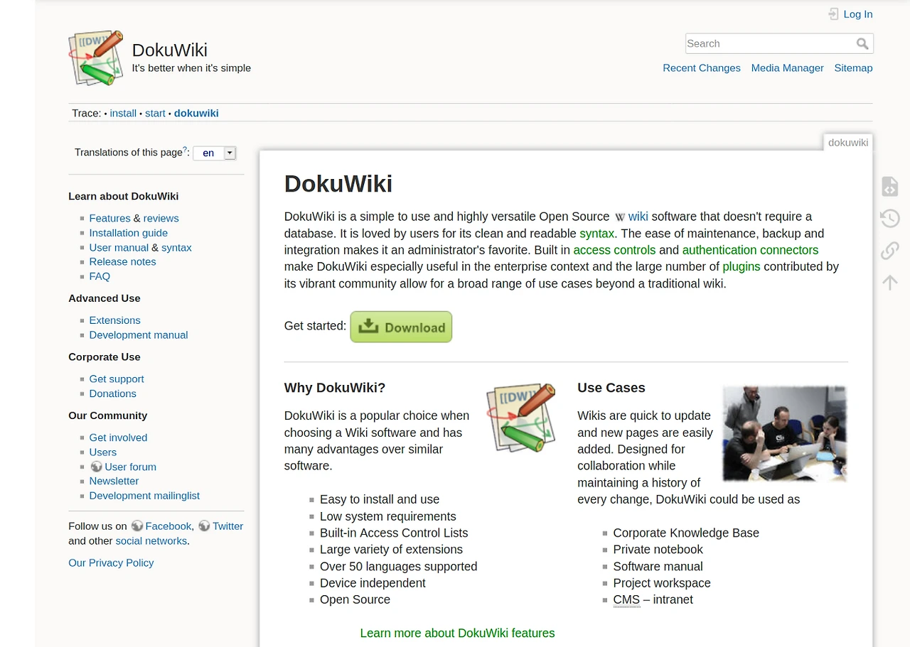 다른 도구들과 비교했을 때 DokuWiki의 장점으로 간소함이 있습니다. 따로 데이터베이스를 준비할 필요가 없고, 작성한 글들은 텍스트 파일로 저장됩니다. 텍스트 파일은 가장 범용적이고, UI도 단순한 만큼 빠르게 반응해, 가볍게 사용할 수가 있습니다. 또한 플러그인을 지원하고 있어, 커뮤니티에서 작성한 다양한 기능의 플러그인을 사용할 수 있습니다.