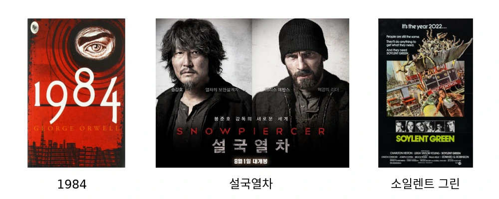통제 사회를 다룬 영화로는 봉준호 감독의 “설국열차”가 있습니다. 얼어붙은 지구 위를 멈추지 않고 내달리는 열차 속에서도 사람들은 계급을 나누어 서로 다른 칸에서 살아갑니다. 열차의 앞칸에는 상류층이 살고, 마지막 칸에는 하류층이 살아갑니다. 앞칸의 사람들은 제대로 된 음식을 먹고 호화로운 삶을 누리지만, 끝 칸의 사람들은 양갱의 모양을 한 정체 모를 음식으로 연명합니다.