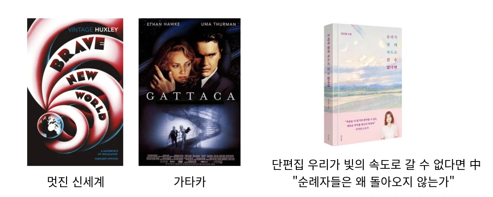 유전적 태생에 의한 차별을 다룬 또 다른 소설로는 김초엽 작가의 단편 “순례자들은 왜 돌아오지 않는가”가 있습니다. 김초엽 작가 특유의 따뜻하고 신비로운 어조로 풀어내는 이야기가 인상적입니다.