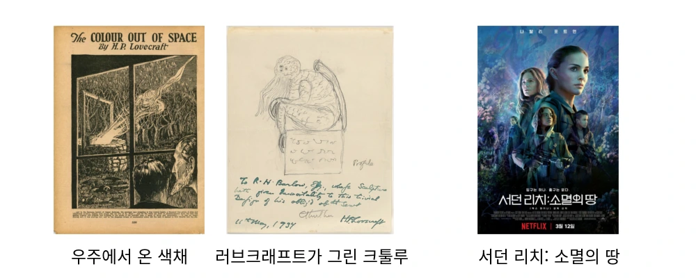 보통의 SF는 보는 이로 하여금 경이감을 불러일으키지만, 공포감을 주는 영화들도 있습니다. 어쩌면 호러로 분류될 수도 있을 작품들을 소개해 보자면, 우주적 공포를 불러일으킨다고 하여 코스믹 호러라는 장르로 분류되기도 하는 작가 러브크래프트의 작품이 있습니다.