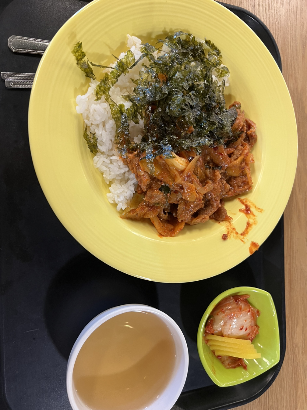 (좌) 낮잠도 자고 과제도 하고 무선충전기가 구비된 학생라운지, (우) 4300원의 제육덮밥(국물과 김치 단무지는 셀프무한리필)