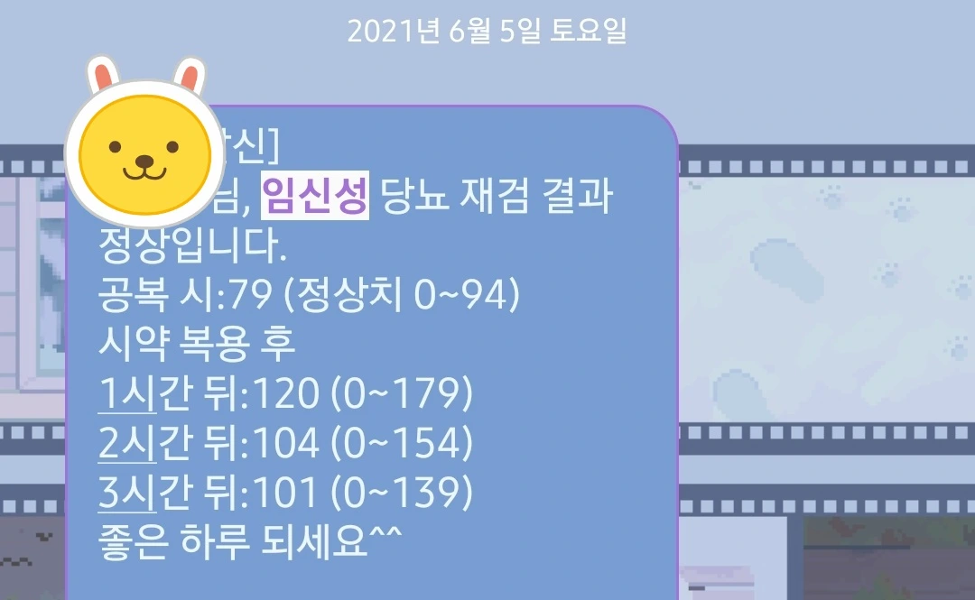 ps. 처음 이 글을 쓴 뒤 한참 지난 지금 말하자면, 이때 임당 검사 결과는 '재검'이었다. 평균보다 결과가 좋지 않았다. 다행히 다시 검사를 받고 나서야 '정상'판정을 받았다.