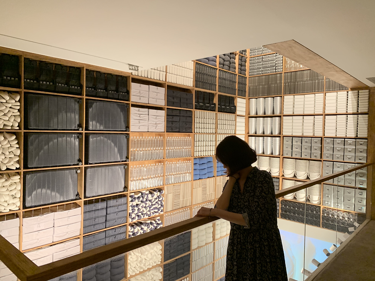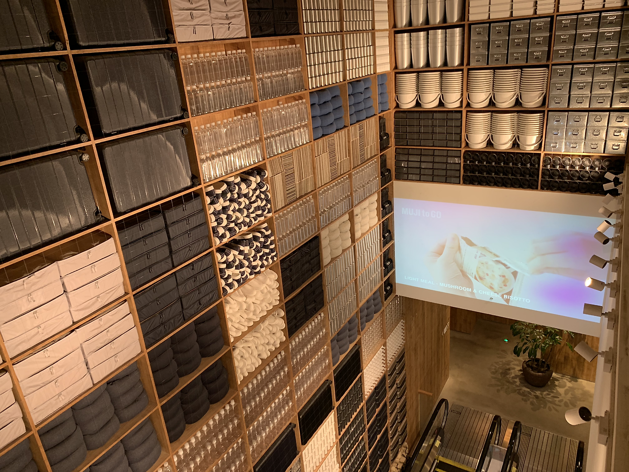 높은 벽이 전부 무인양품의 제품들로 가득 차 있어 멋진 인테리어 효과를 느낄 수 있다.