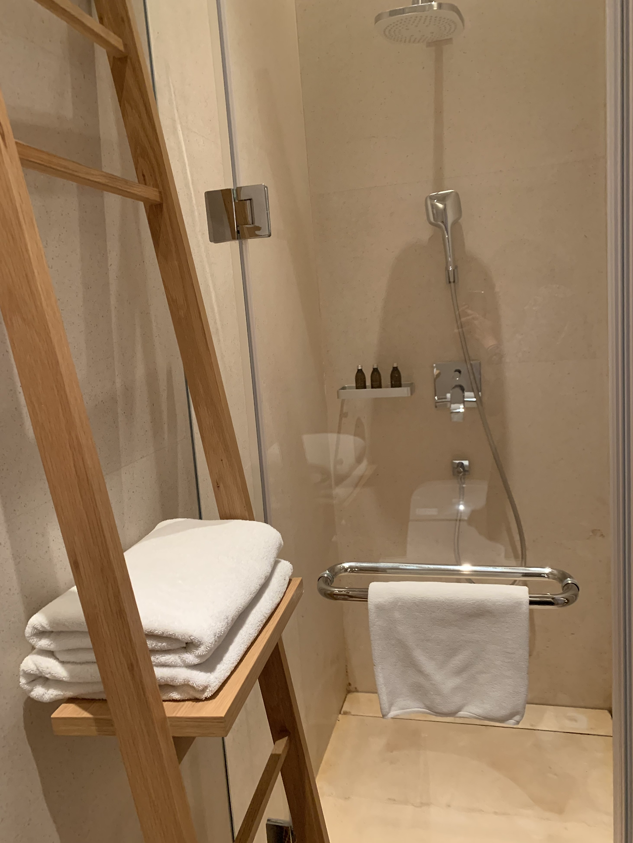 면적이 작은데도 어매니티, 샤워기, 대리석 색감 모든 것이 어우러져 꼭 동남아 휴양지에서 샤워하고 있는 느낌이 들었다.