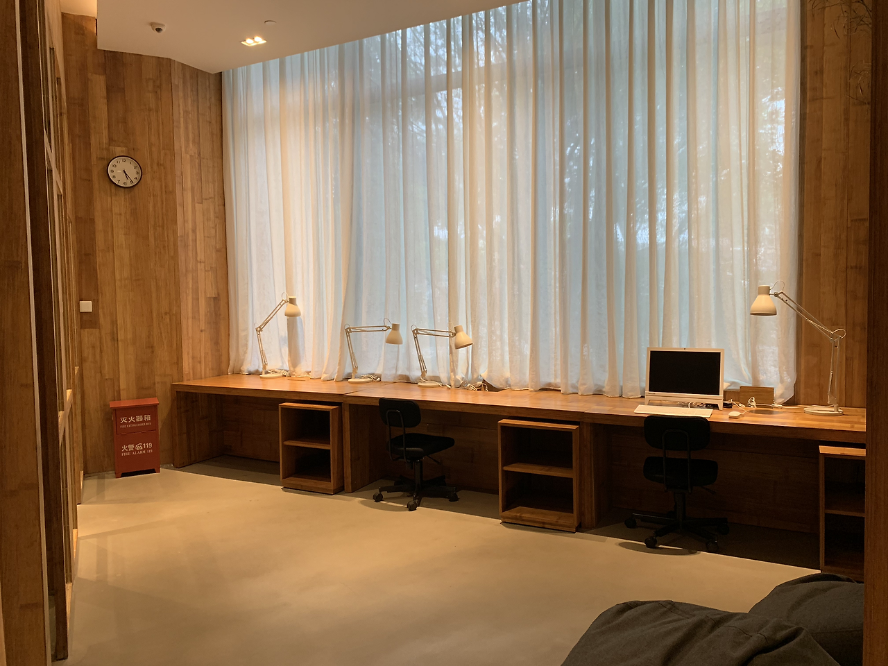 린넨 소재의 하늘하늘한 커튼과 무게감 있어 보이는 원목 테이블, 그리고 PC와 인쇄기 사소한 부분까지도 무인양품의 감성을 놓치지 않고 녹여냈다.