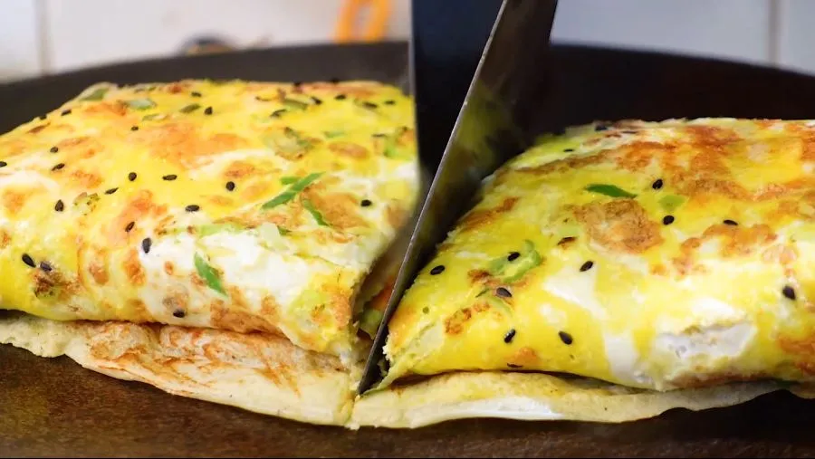 찌엔빙은 얇은 반죽에 바삭한 튀김과 계란을 넣어 먹는 음식으로 다양한 토핑을 추가할 수 있다.