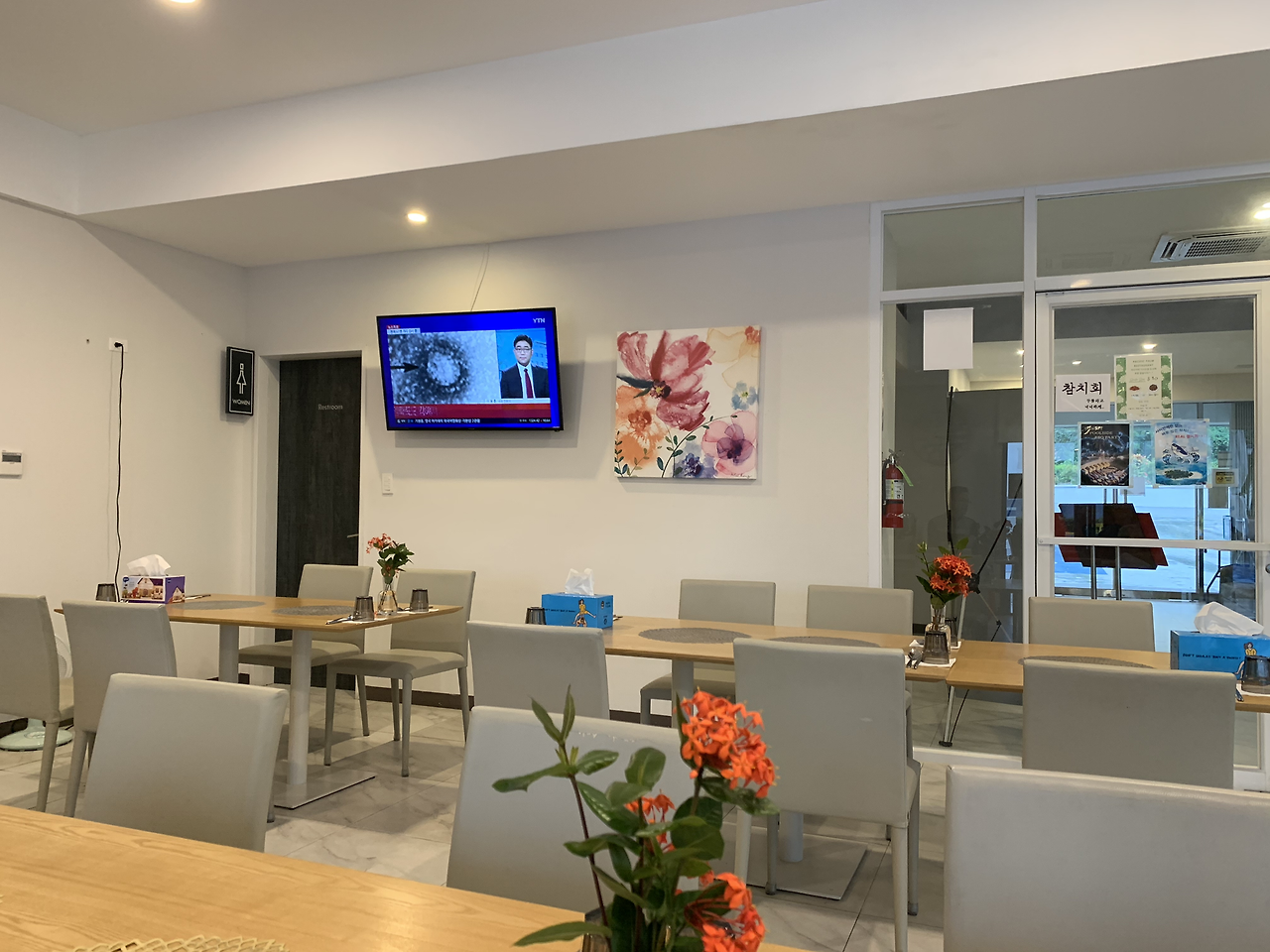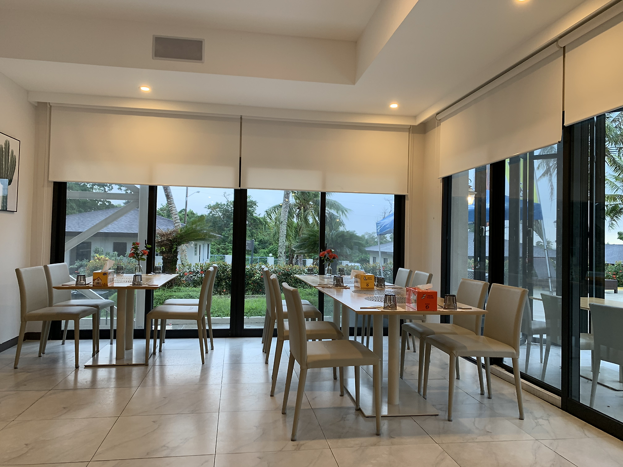 들어서자마자 밖에 보이는 수영장과 휴양지 느낌이 물씬 나는 화이트 인테리어, 테이블에 놓인 생화가 기분 좋은 인상을 주는 그런 곳이었다.