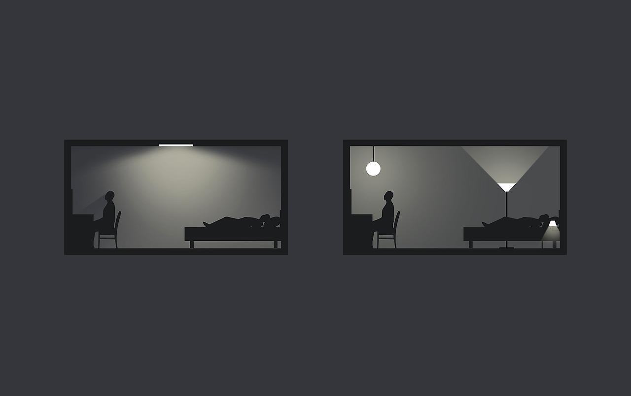 [밝은 건 좋지만 눈부신 건 싫어] 편에서 설명한 것처럼 눈부심은 사람의 중심 시야에서 가장 많이 일어난다. 사람이 주로 활동하는 시야에는 최대한 밝은 빛이 직접 보이는 것을 피해야 하는 이유다. 그런 관점에서 ‘침실’의 ‘방등’은 최악의 조명이다. 사람이 누워있는 행태가 가장 많은 침실 천장 한가운데 바닥을 비추는 조명이 있다는 건 결코 좋은 빛환경이 아니다.