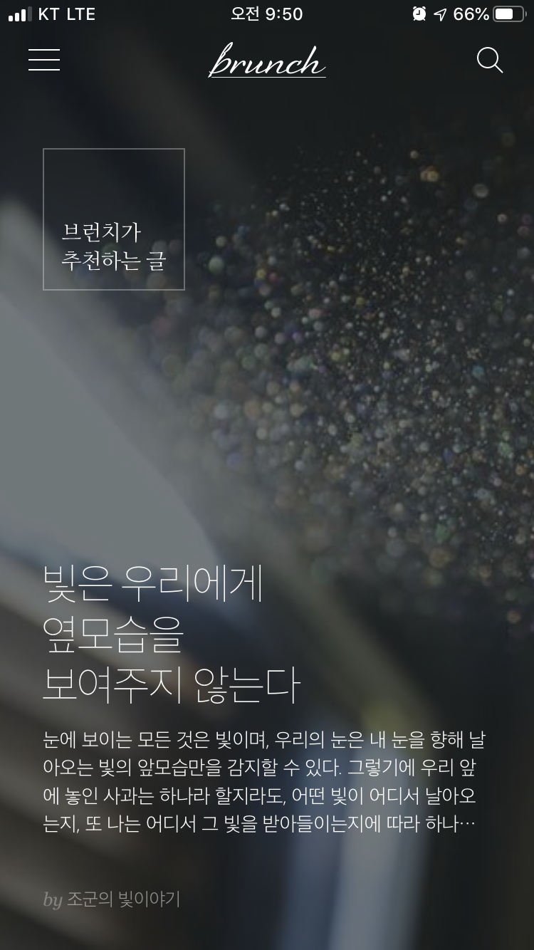 그렇게 자의 반 타의 반 쉬운 글을 쓰려고 노력했기 때문이었을까, 내가 올린 글들은 운 좋게도 생각보다 많은 사람에게 읽히기 시작했다. 다음과 브런치 등에 종종 소개되기 시작했다. 놀라운 일이었다. 심지어 어떤 글들은 생각지도 못한 많은 조회수와 좋아요를 기록해 나로 하여금 하루 종일 앱을 들여다보게 만들었다. 마치 독서모임에서 생각지도 못한 관심을 받았던 그 순간처럼, 많은 사람들이 나의 빛 이야기에 관심 가져줄 수 있음을 다시 한번 확인하는 시간들이었다.