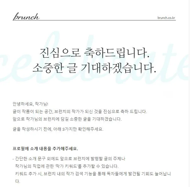 어딘가에 이 이야기를 해보고 싶었다. 이따금씩 개인 SNS에 글을 쓰는 건 좋아했지만 나는 그 흔한 블로그 한번 운영해 본 적이 없었다. 오랜만에 브런치에 로그인을 했다. 그전에 다른 주제로 두 번을 지원했으나 떨어지고 덮어둔 계정이었다. 오랜만에 하얀색 창을 열었다. 그리고 혼자 개인 SNS에 짧게 짧게 써왔던 '조군의 빛이야기'를 처음으로 긴 글의 형태로 작성하기 시작했다. 두 편의 글을 작성한 후 작가를 지원했고 드디어 세 번째에 드디어 브런치 작가로 선정되었다.