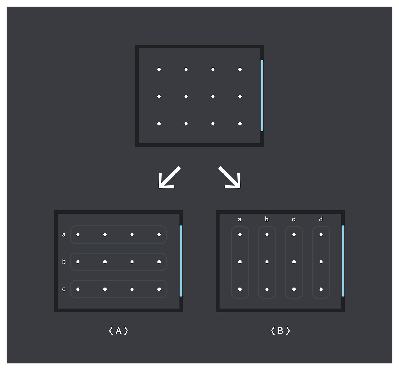 간단한 퀴즈를 풀어보자. 여기 사무실이 있다. 방의 한쪽 면은 직사광이 비추는 남쪽을 바라보고 창문이 나 있다. 천장에는 그림과 같이 동일한 간격으로 12개의 조명이 있다. 만약 조명 스위치를 A처럼 묶는 것과 B처럼 묶는 것 중 하나를 골라야 한다면 어느 것이 좋은 방법일까?