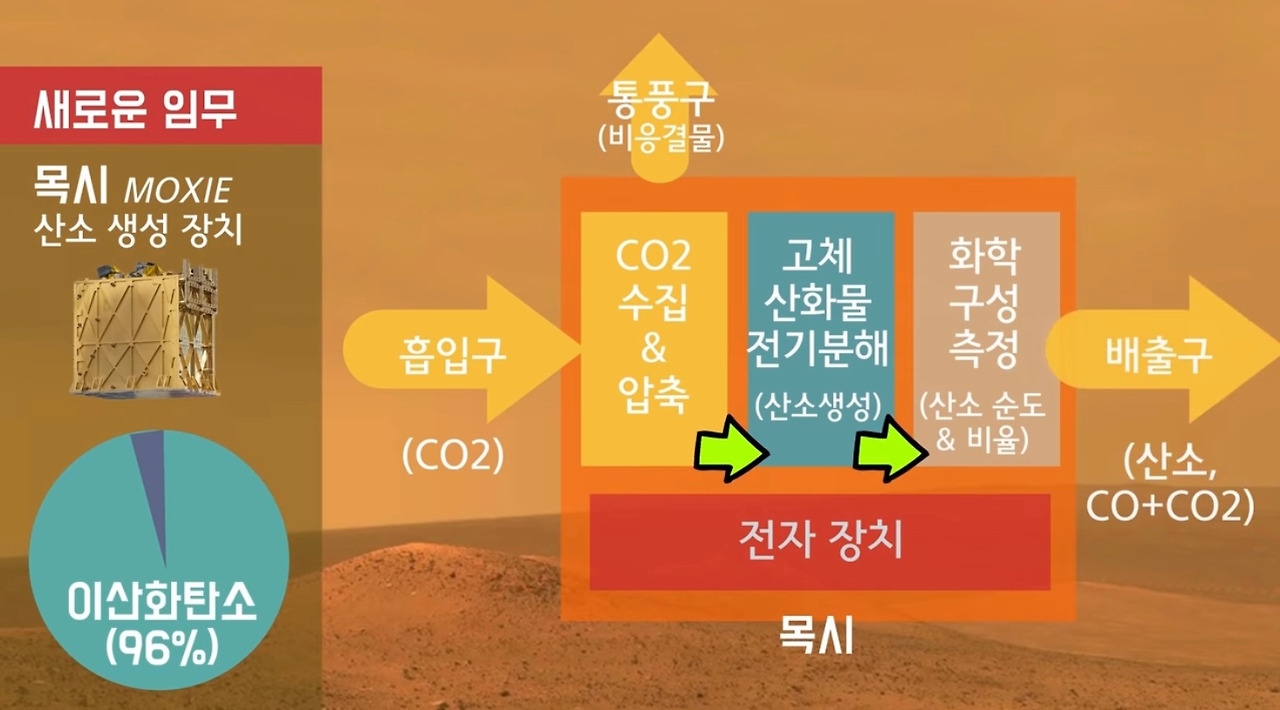 작은 산소 생성장치지만, 테스트를 통해 이산화탄소를 산소로 전환할 수 있는지 점검한다. 이후 이 크기의 200배가 큰 산소 전환장치를 화성에 설치할 계획. 하루에 30t에 해당하는 산소를 생성할 예정이다. 화성을 인류 거주 가능 지역으로 바꾸는 ‘테라포밍’의 작은 시작.