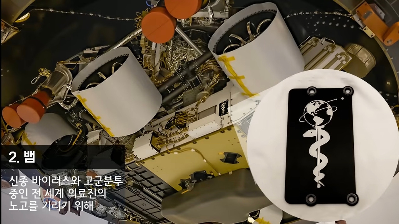 2020년의 가장 큰 전 세계적 이슈는 뭐라 해도 코로나. NASA에선 탐사선 하단 측면 쪽에 뱀의 이미지를 새겨 넣었다.