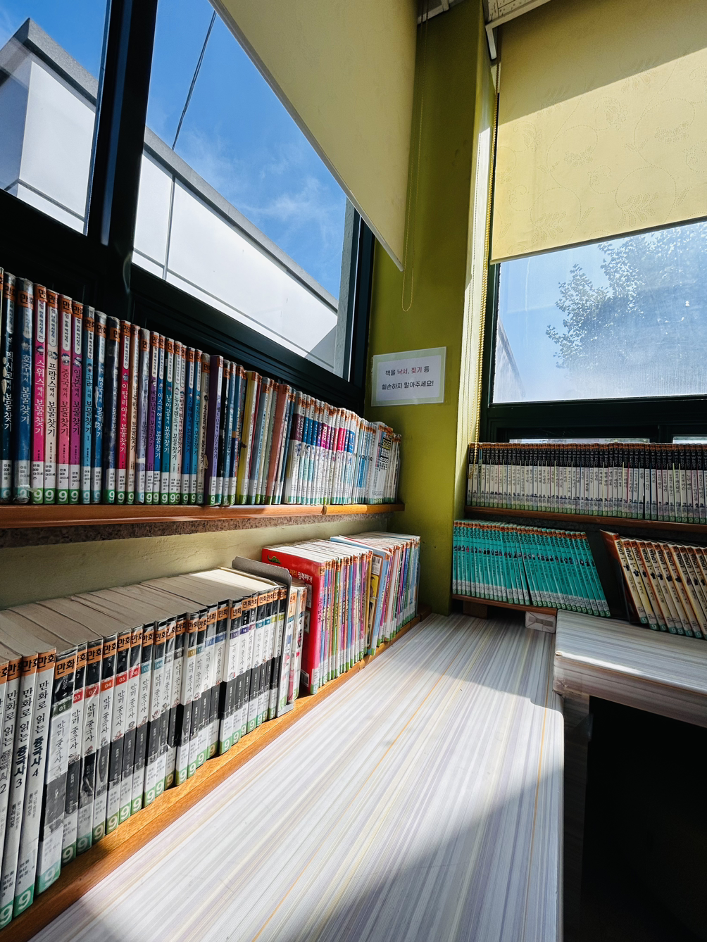 아이들 책으로 가득한 시골 도서관 어린이 자료실 한 모퉁이 자리에 앉았습니다. 그간 열심히 읽었을 아이들의 손때가 책마다 묻어 있는 듯합니다.