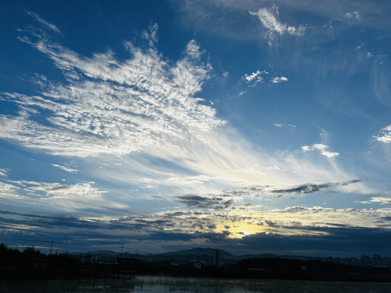 호수 물 위로 올라오는 수증기(?)가 기온 변화 때문일까, 한 여름 도로 위의 아지랑이처럼 올라왔다. 그 아름다운 풍경을 담을 수조차 없었다. 해가 뜨고 밝아올 때쯤 펼쳐진 하늘과 구름은 신비로움의 경이감을 자아냈다. 이 아침에 이런 풍광을 보게 될 줄이야!