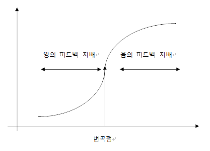 양의 피드백 루프 지배에서 음의 피드백 루프의 지배로 바뀌는 지점을 변곡점(Turning Point)라고 한다. 양의 피드백 루프가 힘을 잃는 변곡점 이후에도 시스템의 성장은 지속적으로 이루어진다.
