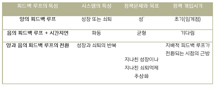 음의 피드백 루프가 지배하는 시스템은 성급한 정책개입보다는 기다리는 정책이 강조된다. 성급한 정책개입을 시도하기보다는 시스템이 스스로 안정화되기를 기다리는 정책이 권고된다.