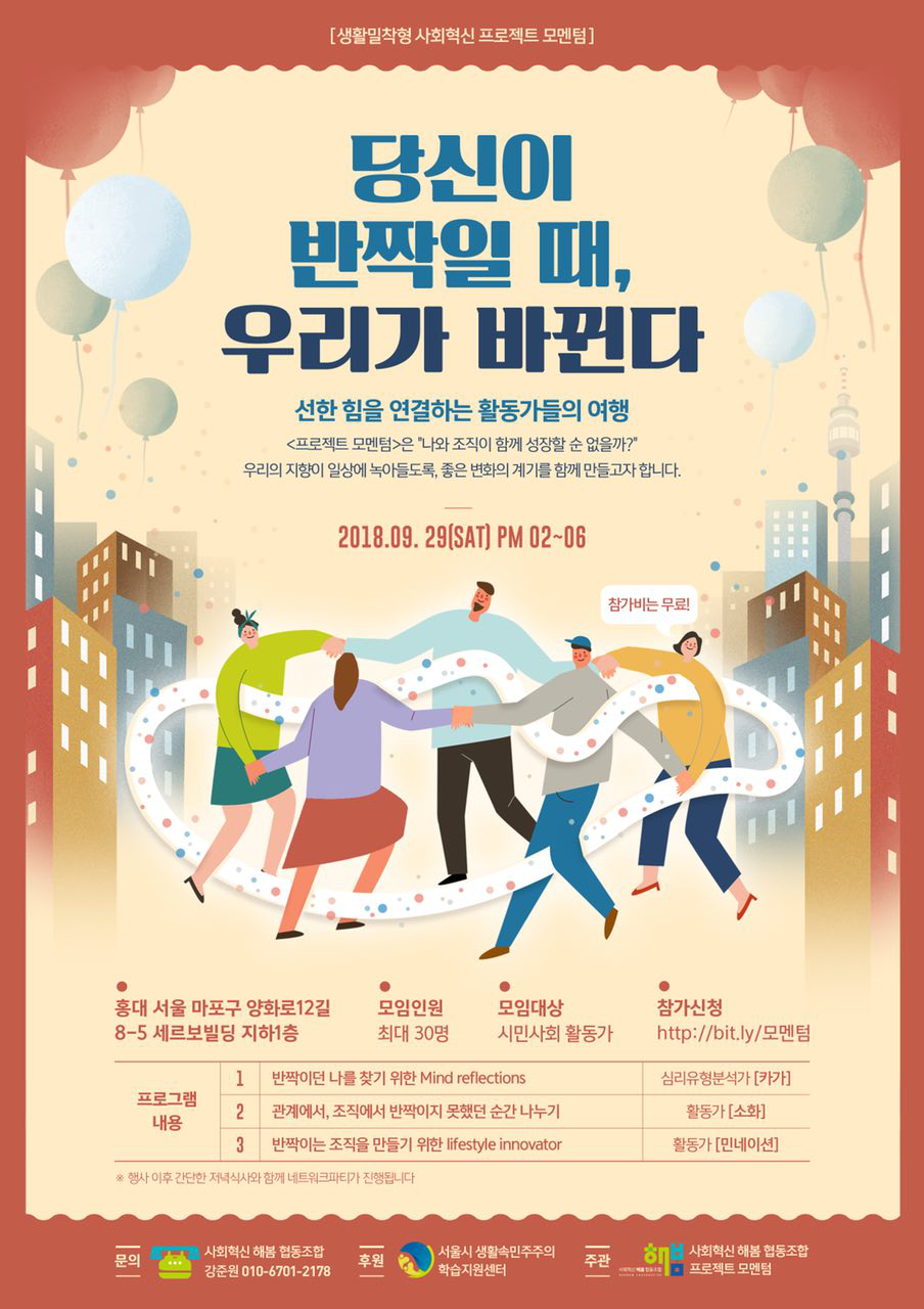 지금까지 존재하는 것만으로도 조직은 나름의 사이클로 잘 돌아가고 있는 것이다. 문제는 그 조직의 존재이유가 시대적 상황에 맞는가이다. 시대와 의지가 만나면 빛이 나게 되어 있다. 아무리 별이 빛난다하더라도 밤이 아니면 그것이 빛인가? 우리 조직이 정말로 빛나던 순간, 우리가 서로의 존엄을 확인하고 숭고한 미래를 그리던 순간, 그리고 우리가 하고 있는 모든 것들이 각자의 미래에 실현될 기대로 지냈던 순간이 있었는가? 있었다면 다시 한번 우리가 빛난던 순간으로, 없었다면 이제 함께 그 빛을 만들어가는 걸로. 나의 진솔한 이야기를 나누려고 한다. 내가 잘했으니 따라오면된다 혹은 벤치마킹하면된다라는 식의 전달식이 아니라 왜 내가 그토록 치열하게 싸웠는지, 그리고 그러면서 무엇을 배웠는지 그래서 결국 '우리의 존엄'이 어떤 방식으로 지켜지는지를 함께 공유하고 싶어서 시간을 마련했다. 함께 마음을 모아서 '모멘텀'을 준비한 친구들에게 감사한다. 이제는 함께 걸어가자.