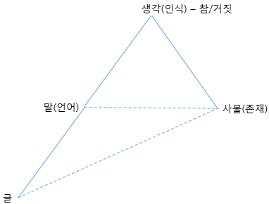 머리(혼) 안의 생각(사유)이나 느낌(감각)은 사물 또는 대상에 대한 사유적, 감각적 표현이며, 말은 생각이나 느낌에 대한 언어적 표현이며, 글은 말에 대한 문자적 표현이다. 사물을 닮는 혹은 모방하는 수단은 사유 능력이나 감각 능력이며, 생각이나 느낌을 나타내는 수단은 말소리이며, 말을 나타내는 수단은 글자이다.