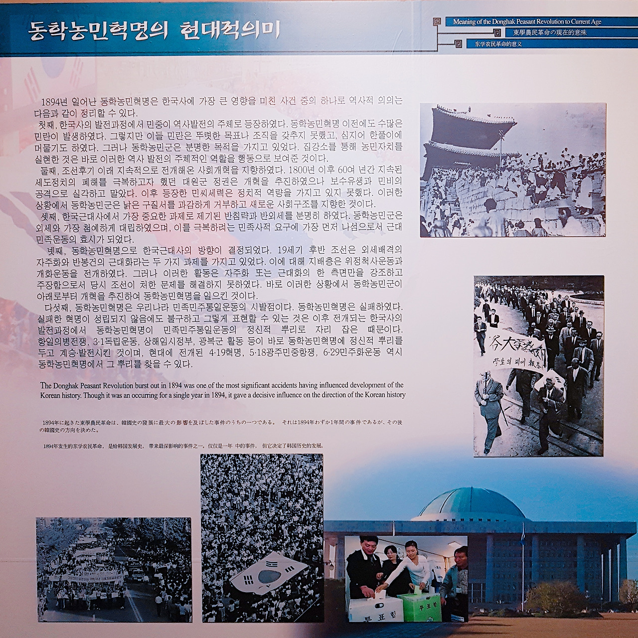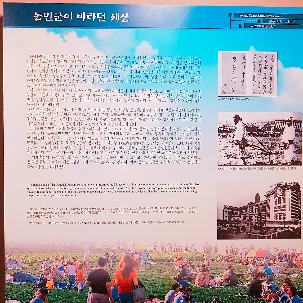 시간이 조금 남아서 정읍에서 유명하지만 잘 관리가 안되는 것 같은 동학농민운동 기념관에 왔다. 멀리 평야가 보이고 그 사이에 크지만 허술한 박물관이 있다. 아무도 찾지 않을 것 같은 저녁시간에 잠시 들렀다. 동학이 가지고 있는 운동성과 농민들 안에서 스스로의 개혁의 씨앗을 발견했다는 아름다운 이야기를 기억하면서 어느덧 나는 서울에 도착했다.