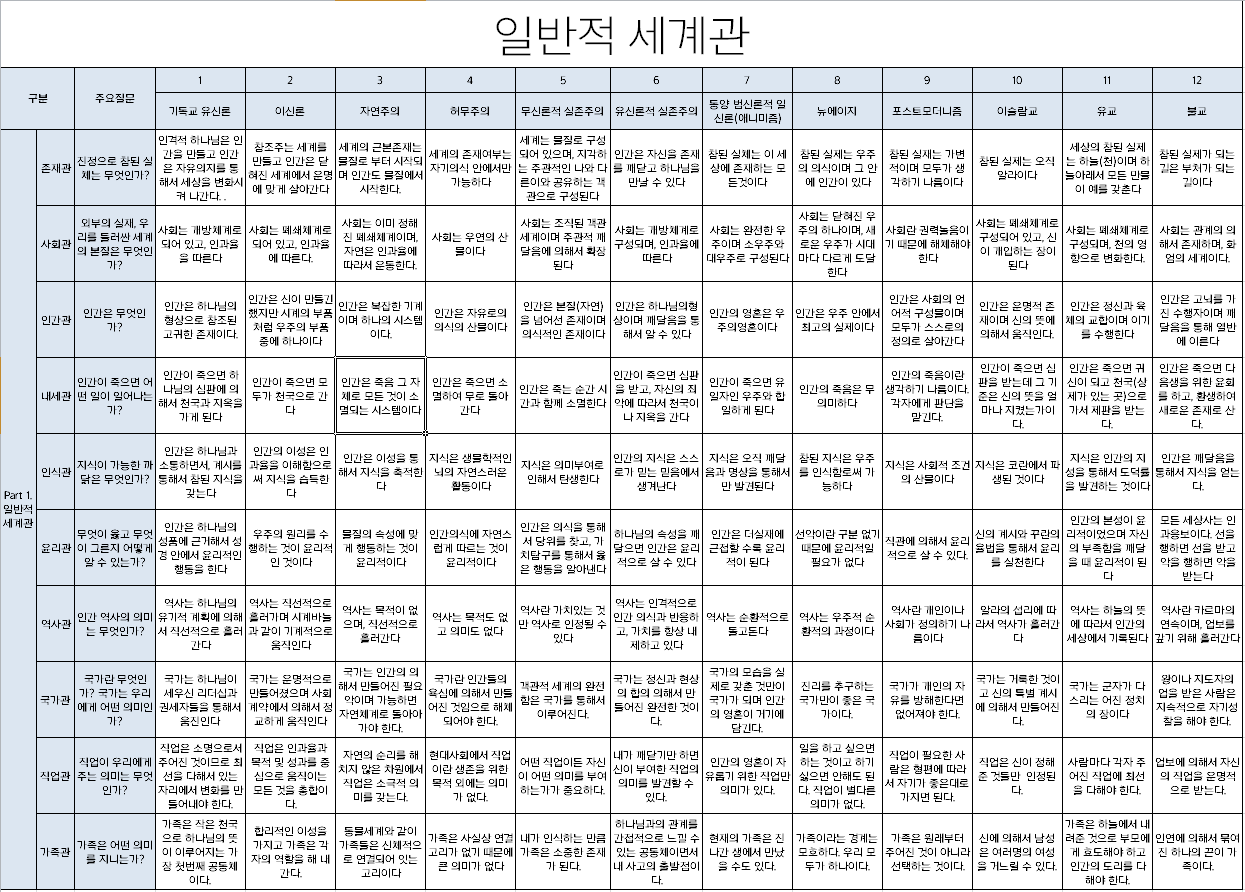 ① 서양인들에게 자신과 타인, 자연계와 하나님, 혹은 궁극적 실재에 대한 사고 방식의 기초가 되는 기본적 세계관을 개요하는 것이다.