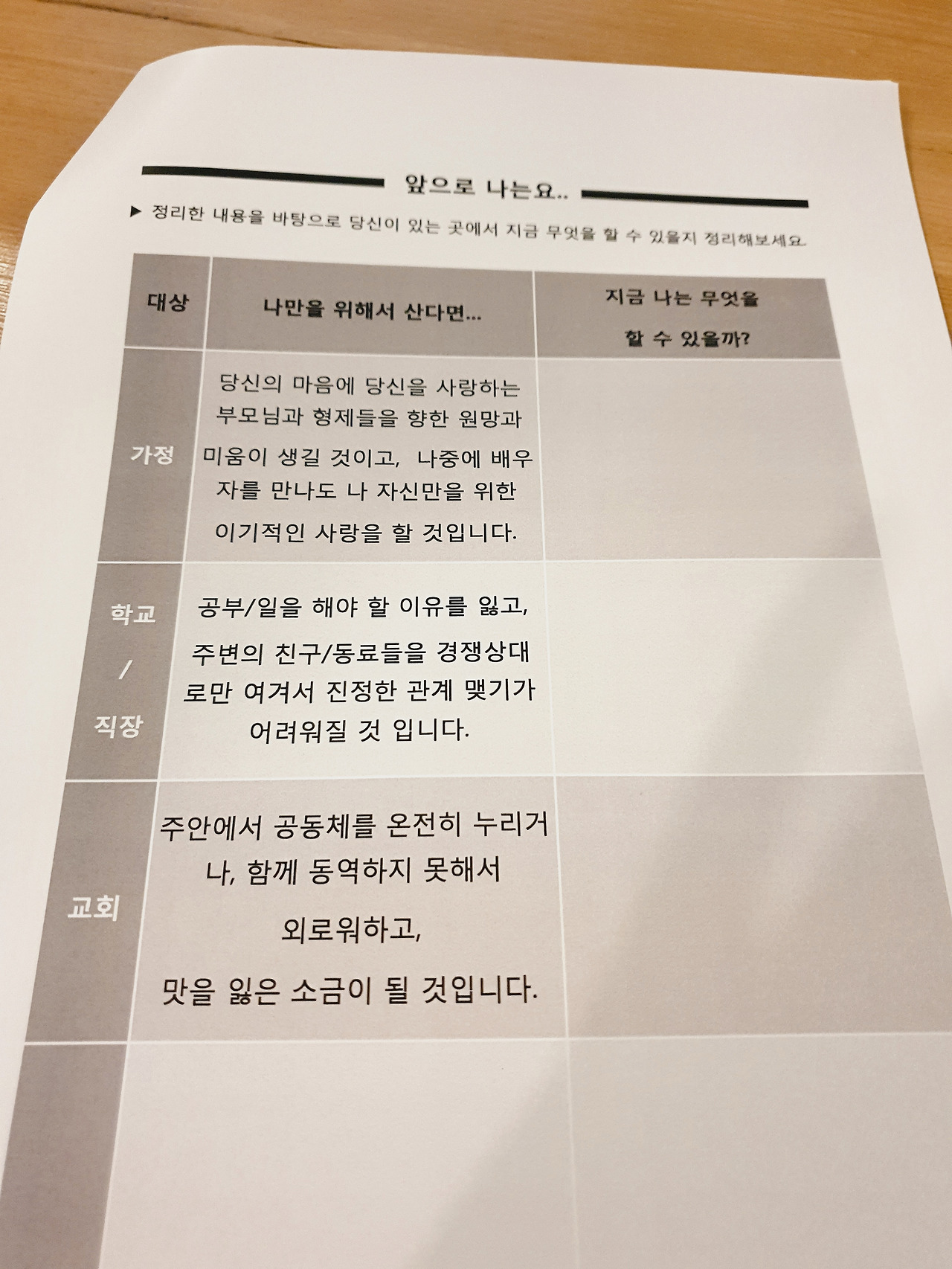 하나님이 확실하게 나의 소명을 아려주면 좋겠다. 그러면 진짜 잘 살 수 있는데라고 생각했다. 이전에 이랜드 외식사업부에서 일했고, 일에 전념했다. 정말 회사에서 모든 것들을 했다. 6년동안 오로지 일만하다가보니깐 무엇도 준비된게 없었다.
