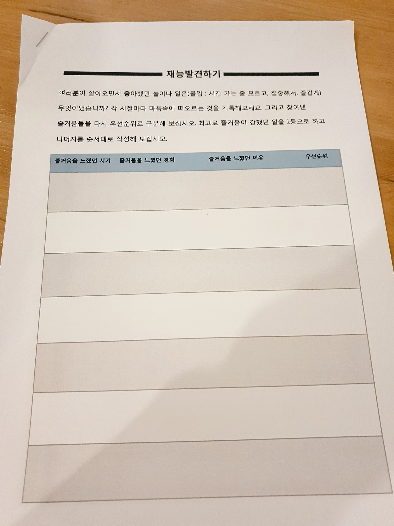 여러분이 살아오면서 좋아했던 놀이나 일은(몰입 : 시간 가는 줄 모르고, 집중해서, 즐겁게) 무엇이 있습니까? 각 시절마다 마음 속에 떠오른ㄴ 것을 기록해보세요. 그리고 찾아낸 즐거움들을 다시 우선순위로 구분해 보십시오. 최고로 즐거움이 강했던 일을 1등으로 하고 나머지를 순서대로 작성해 보십시오.