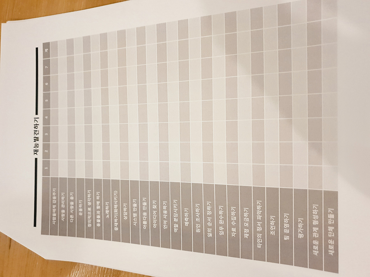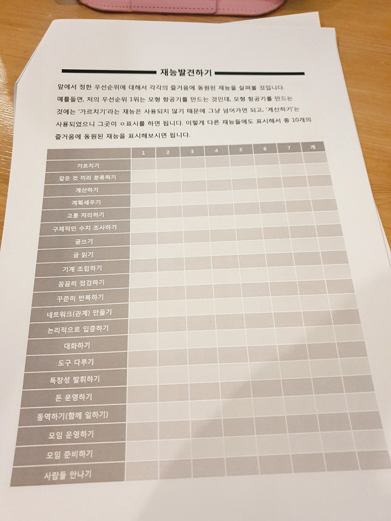 앞에서 정한 우선순위에 대해서 각각의 즐거움에 동원된 재능을 살펴볼 것입니다. 예를 들면, 저의 우선순위는 모형 항공기를 만드는 것인데, 모형 항공기를 만드는 것에는 ‘가르치기’라는 재능은 사용되지 않기 때문에 그냥 넘어가면 되고, ‘계산하기’는 사용되었으니 그곳이 0표시를 하면 됩니다. 이렇게 다른 재능들에도 표시해서 총 10개의 즐거움에 동원된 재능을 표시해보시면 됩니다.